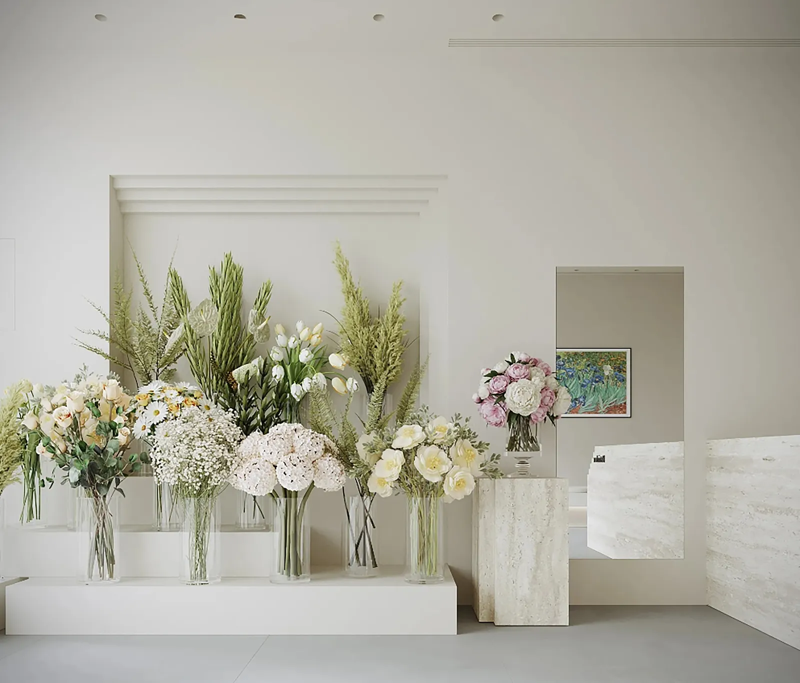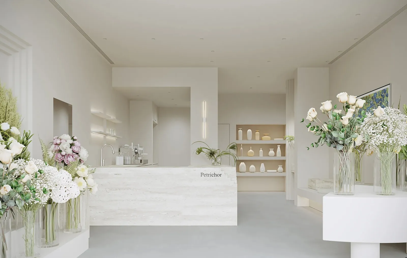 Petrichor花店主理人找到我设计,设计之初他就明确希望是一个纯白色的花店空间。在极简纯粹的空间设计中,融入卡洛斯卡帕的叠级手法,并加入洞石岩板体现高级感。门头的设计内退,将一部分空间留给外部日常做花艺展示,并且用整块玻璃将店内的鲜花绿植作为橱窗展示,在街道上就是一道亮丽的风景,吸引路过的人驻足。